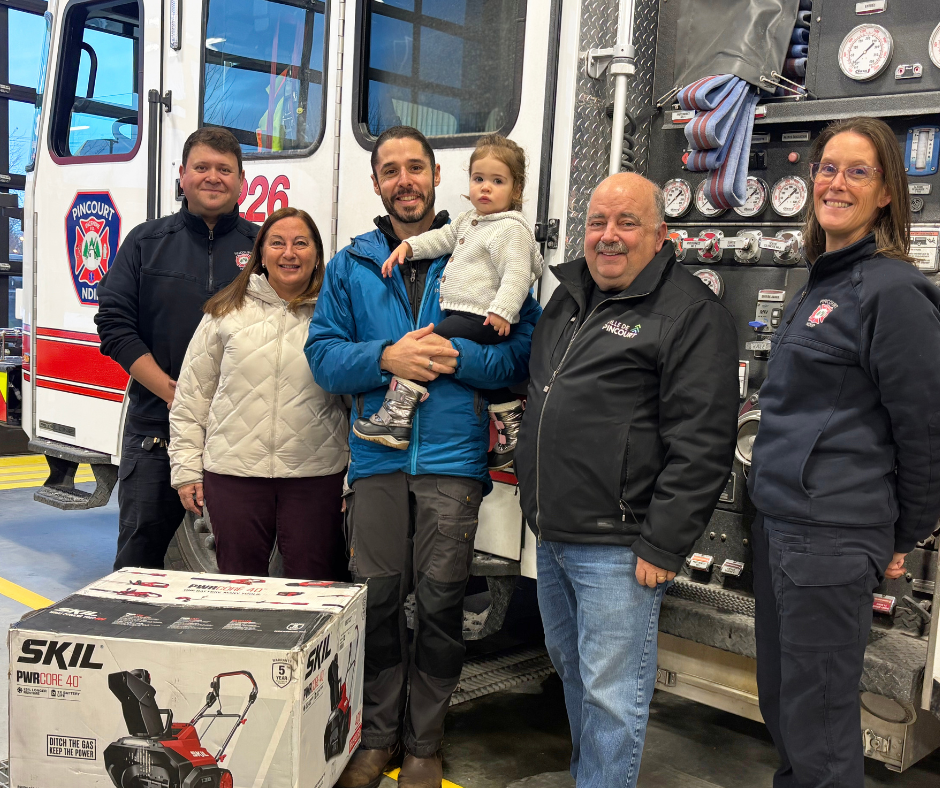 Ce prix lui a été remis à la caserne 26 par Monsieur Nicolas Demurtas, capitaine à la prévention, et Madame Judith Boyer, préventionniste et pompière, du Service d'urgence et de protection incendie de Pincourt / Notre-Dame-de-l'Île-Perrot, en présence de Madame Danie Deschênes, mairesse de Notre-Dame-de-l'Île-Perrot, et Monsieur Claude Comeau, maire de Pincourt.