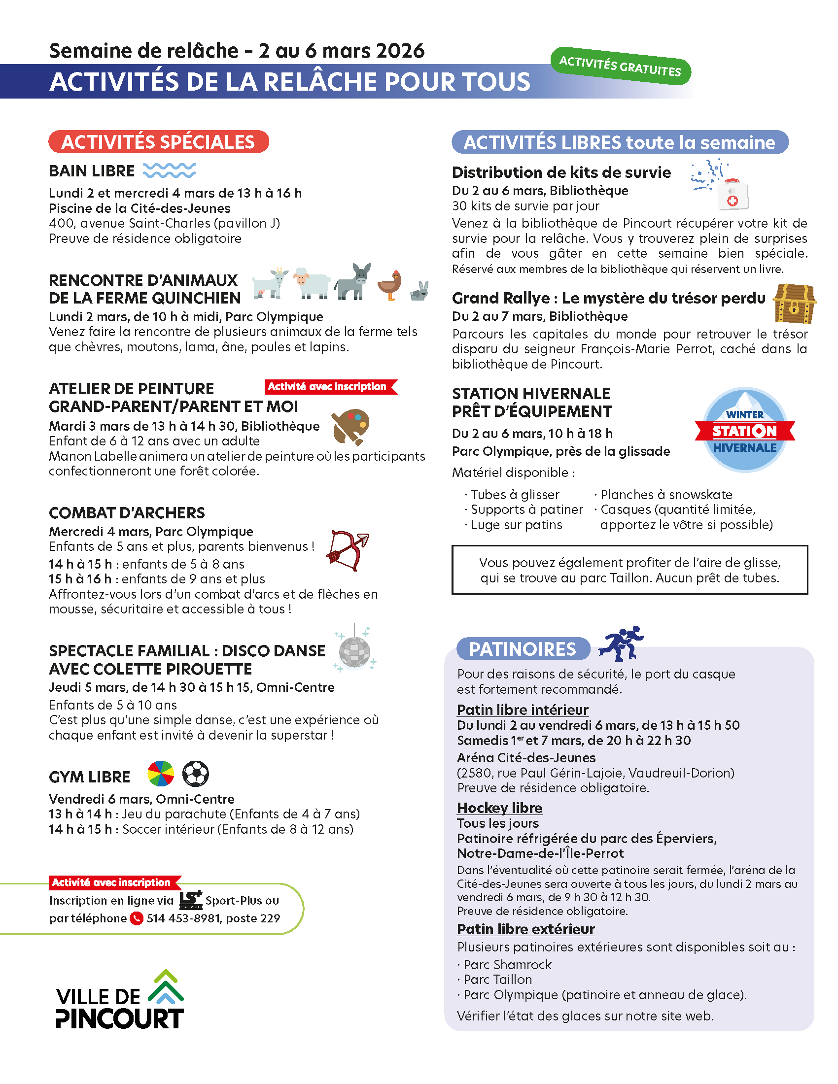 Inscription via Sport-plus ou par téléphone 514 453-8981, poste 229 du 9 février à 9 h au 22 février (places limitées).SERVICE DE GARDE